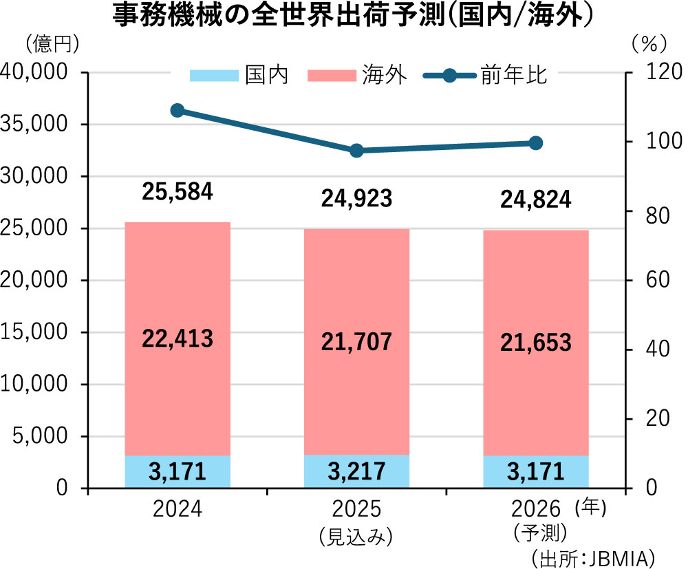 ビジネス機械・情報システム産業協会(JBMIA)は9日、複合機やプリンターなど事務機械の「全世界出荷に関する2025年の見込み及び2026年の予測」を発表した。2025年の国内外合計の出荷金額は前年比2.6%減の2兆4923億円となる見通し。国内は微増となる一方、景況感の悪化により海外が減少すると見込んだ。26年は国内、海外ともほぼ横ばいを予想した。