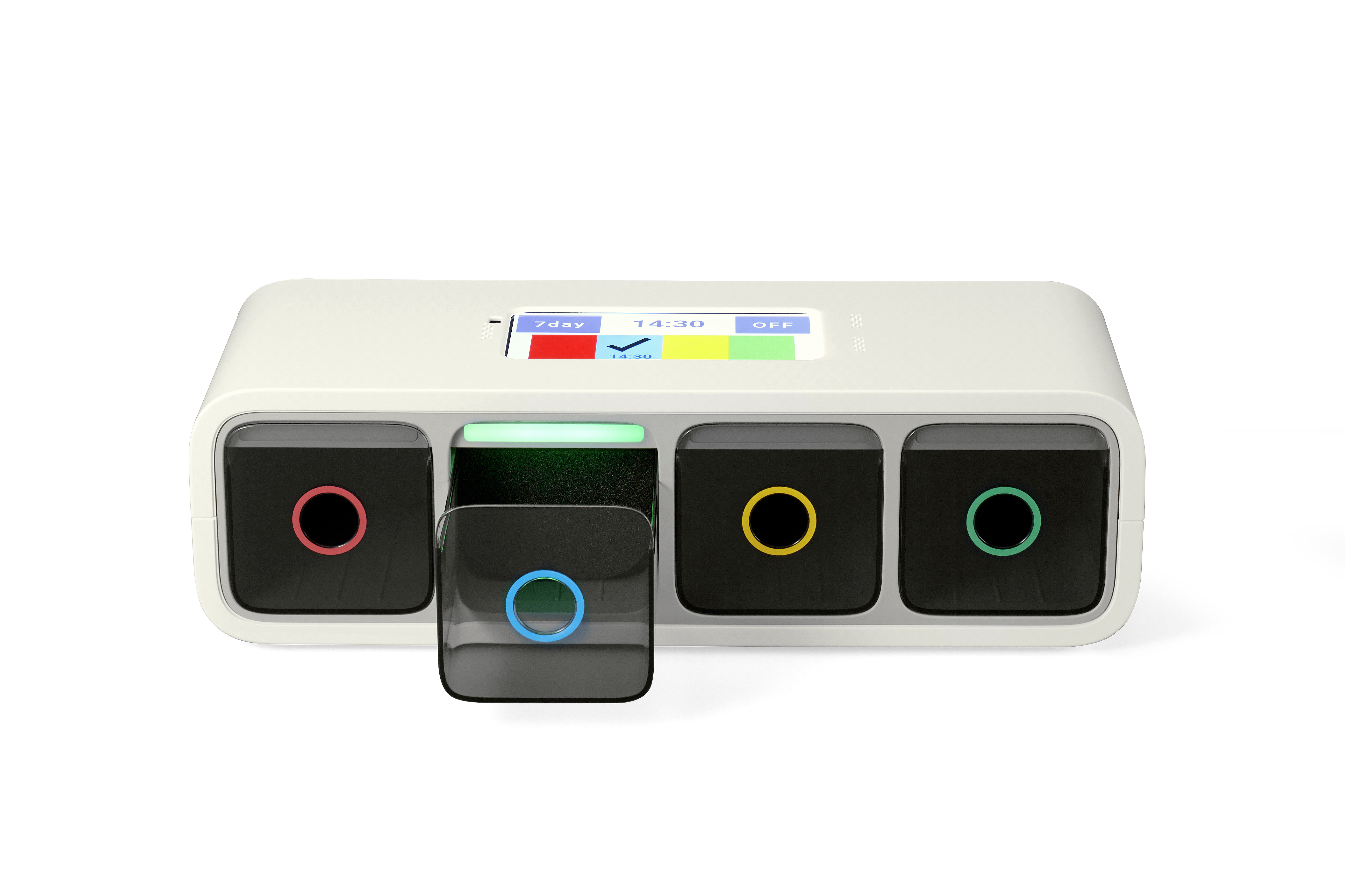 SMKのスマート薬箱は、4つの引き出しを備えた服薬支援デバイスで、設定時刻になるとLED点灯と音声で服薬を知らせ、引き出しの開閉を検知して記録する。スマートフォンアプリを通じて服薬状況を可視化し、クラウド経由で薬剤師や家族が確認できる。これにより、薬の「飲み忘れ」「飲み間違い」「飲み過ぎ」を防ぐとともに、服薬行動データを活用した新たな服薬支援モデルの確立を目指している。