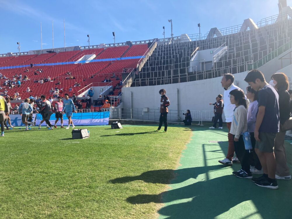 試合が始まるとサポーターがフラッグを振って応援する雰囲気を感じつつ、大きな声で応援しながら観戦を楽しんだ。FC大阪の近藤祐輔社長は「プロの選手と触れ合う機会はあるようで少ないのが現状。プロが使うピッチに入れる貴重な体験となったと思う。プロチームが東大阪にあるからできること。普段はできない体験を楽しんでほしい」と語った。
