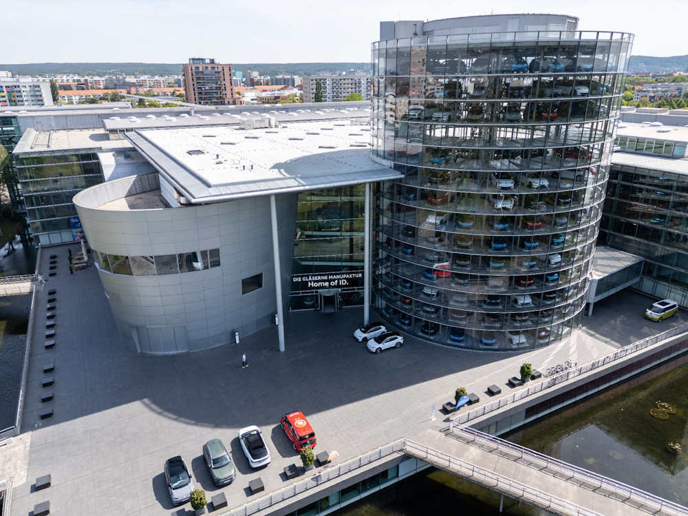 ガラス張りの外観が特徴的な独フォルクスワーゲンのドレスデン工場=5月14日(AFP時事)