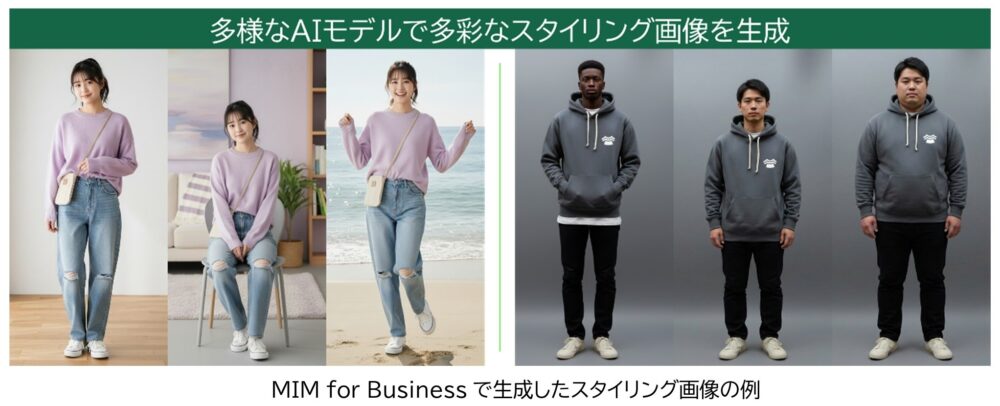 MIM for Businessは、1枚の既存商品画像からAIモデルによる多様な着用イメージを自動生成できるサービス。生成されるAIモデルは、身長、体重、年齢、人種、性別、ポーズ、背景などの属性情報を自由に設定でき、顧客が自身に合った着用感を直感的に理解できる画像を提供。リアルで没入感のある着用体験を実現し、ECサイト全体の表現力と訴求力の強化につなげる。
