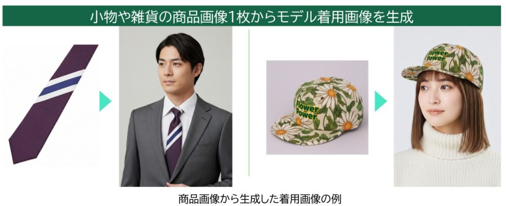特に従来の撮影コストでは採算が合わなかった少量生産品や小物、雑貨などに対しても安価で迅速に対応できるのが特徴。即日生成による納品も可能で、商品掲載までのリードタイムを短縮し、機会損失を防ぐ効果が期待される。生成された着用画像は原則として使用期限がないため、継続的な利用が可能であるほか、過去シーズンの商品と新作アイテムを組み合わせたコーディネート画像生成にも対応し、在庫活用の幅を広げる。