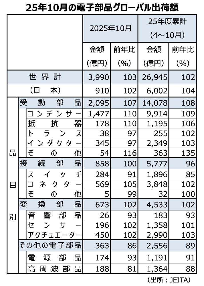 電子情報技術産業協会(JEITA)が発表した2025年10月度の電子部品グローバル出荷額は前年同月比3.0%増の3990億円となり、前月から増加率は縮小したが2カ月連続で前年同月比プラスとなった。AI(人工知能)サーバー・データセンター(DC)関連市場の拡大や産機向けの回復などが需要をけん引した。地域別出荷は中国を除く全ての地域で前年同月を上回った。