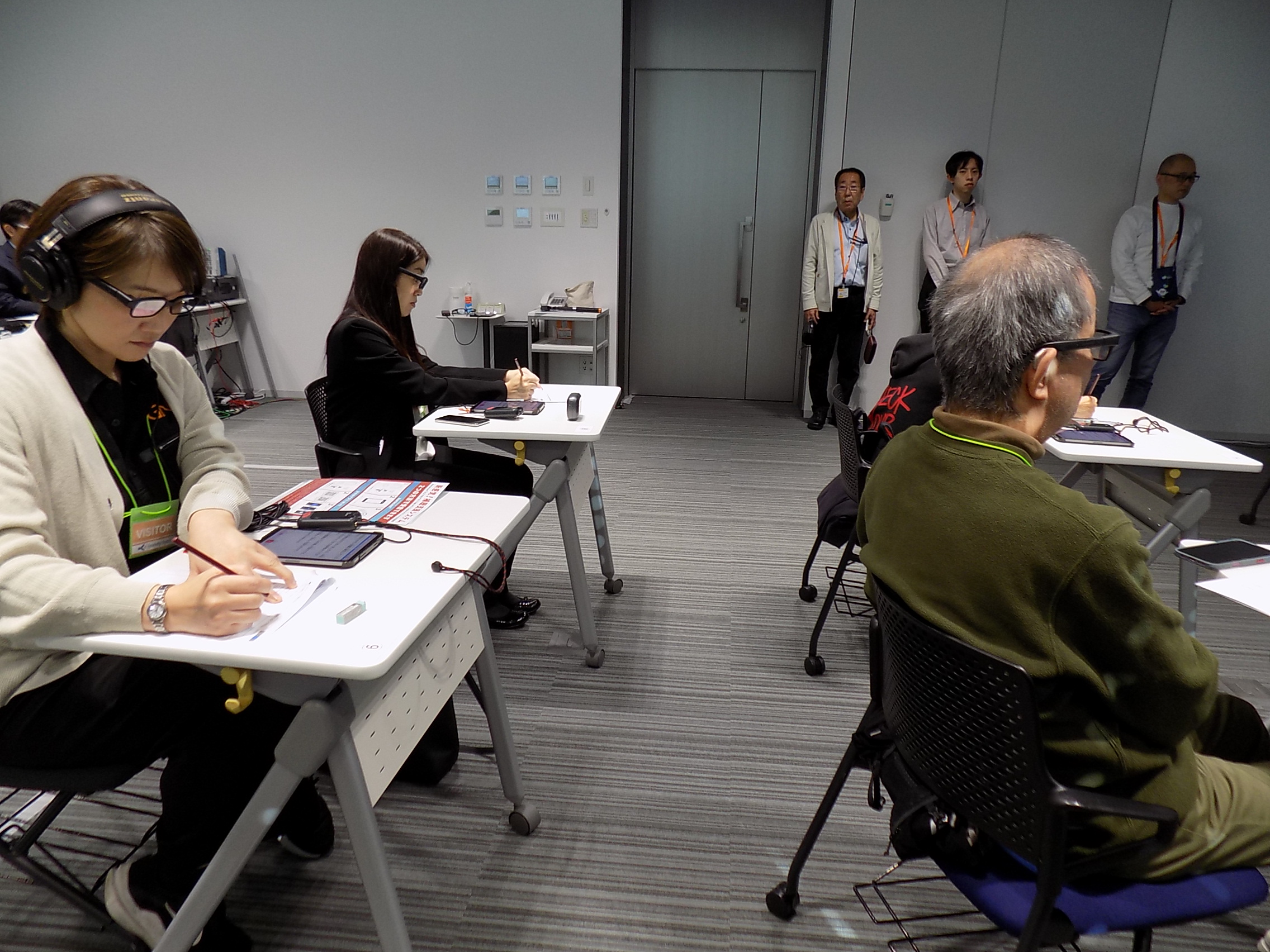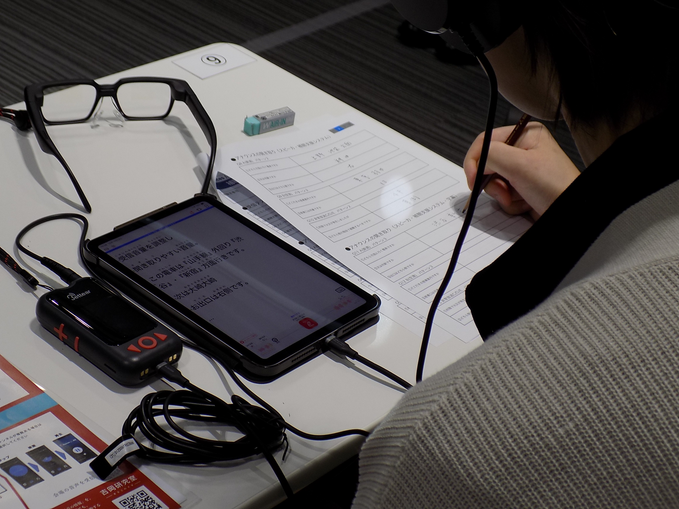 実験では、「スピーカーのみの聞き取り」「スピーカーと補聴支援システムでの聞き取り」「スピーカー、補聴支援システム、字幕表示機能」「スピーカー、補聴支援システム、スマートグラス」という4パターンを用意。その中で、参加者からアナウンスの内容を問うアンケートを実施。どのパターンの内容が理解できたかを確認した。参加者は「大いに役立つシステムだと感じた。アンケートはもう少し簡単に答えることができるものにしてほしい」と話していた。