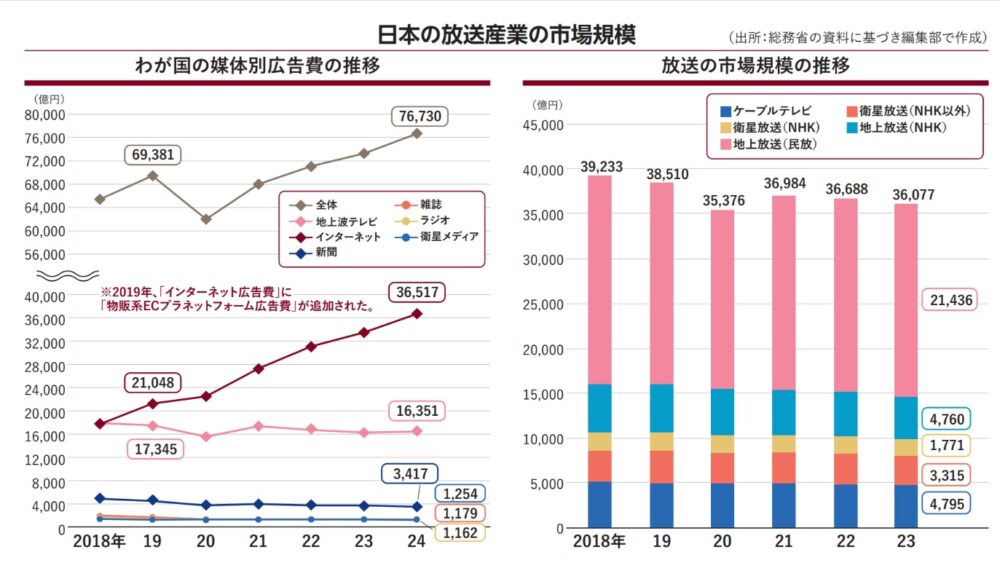 スマートフォンの普及や通信速度の高速化といった技術発展や、動画配信サイトの視聴者層拡大が追い風となり、20年にはインターネットの利用時間がテレビの視聴時間を上回った。スポンサー企業のターゲット層とテレビ視聴者層の違いも指摘され、19年にはインターネット広告の売り上げがテレビ広告を上回った。23年には地上波テレビ広告との差がさらに拡大。放送の市場規模は微減の傾向にあり、ピーク時の2007年の約4.1兆円から約3.6兆円まで落ち込んだ。