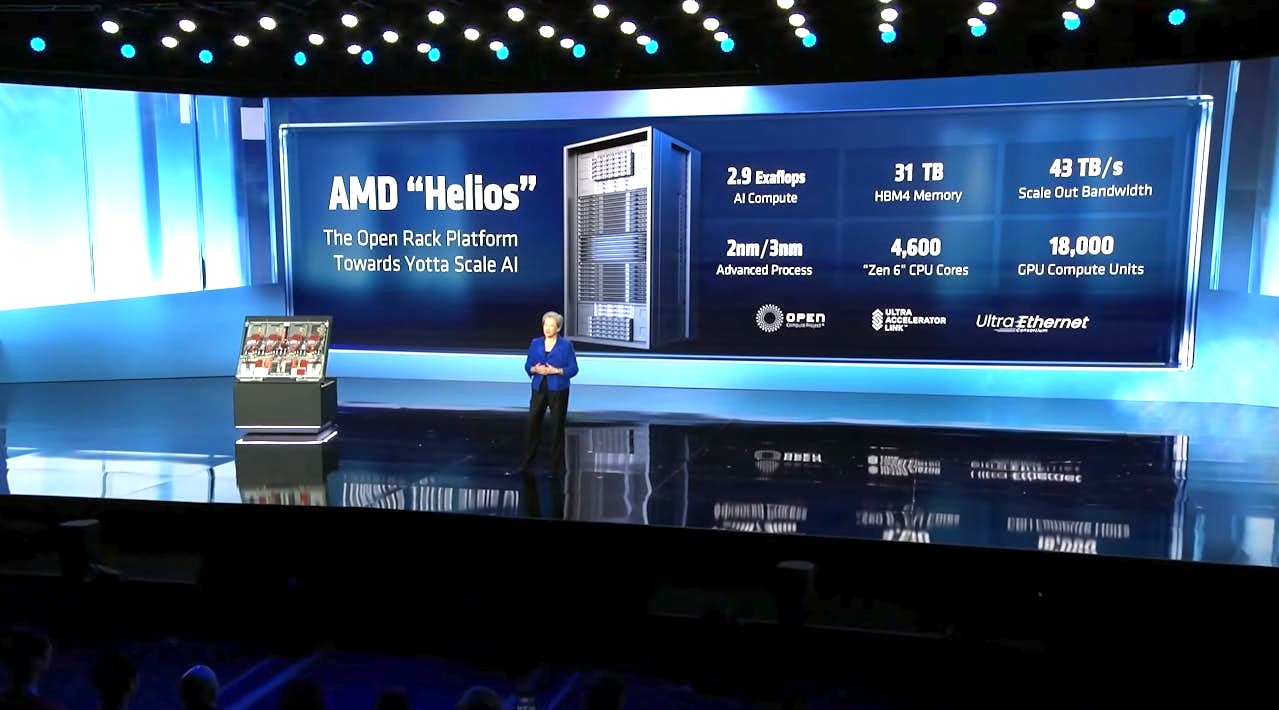 スーCEOは今回、極限のコンピューティングに関する課題に対応し、ヨタ構想を可能にする次世代ラックシステムの「Helios(ヘリオス)」を紹介。Heliosを支える基幹部品として、CPU「EPCY Venice」やGPU(アクセラレーター)の「Instinct MI455X」を紹介。コンピューターやサーバーをネットワークに接続するためのスマートNIC(ネットワークインターフェイスカード)「Pensand Vulcano」や、ソフトウエア「ROCm」などの半導体やオープンソフトウエアも披露した。