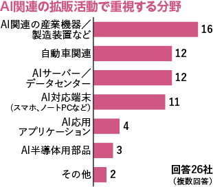 電波新聞がこのほど主要電子部品メーカーを対象に実施したアンケートによると、「AI関連の拡販活動で重視する分野(複数回答)」の質問では、回答26社で最も多かったのは「AI関連の産業機器/製造装置など」の16社。次いで多かったのは「自動車関連」と「AIサーバー/データセンター」が12社で並び、次が「AI対応端末」だった。