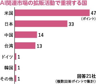 「AI関連市場で拡販活動を重視する国(複数回答)」の質問では、最も多かったのは、米国が47ポイントと最多で、次が日本の33ポイント。以下、中国、台湾の順となった(優先順位別に挙げてもらい、1位=3ポイント~3位=1ポイントで集計)。