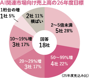 「AI関連市場向け売上高の26年度の目標(25年度見込み比)」の質問では、回答18社で最も多かったのは「2~5倍未満」と答えた5社。次が「50~99%増」の4社だった。全体では、8割超の15社が「2桁以上の増」と回答するなど積極姿勢が鮮明となっている。