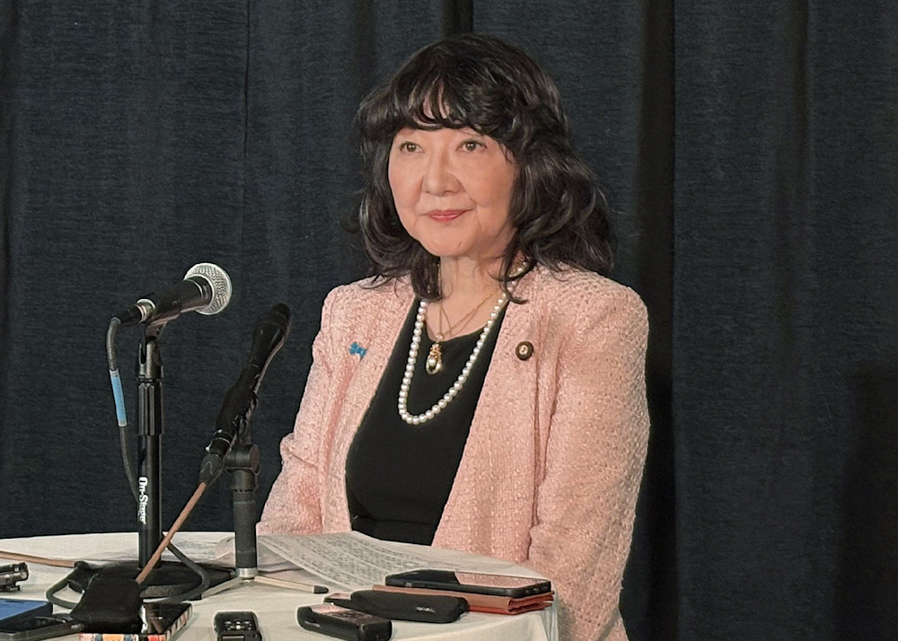 記者団の取材に応じる片山さつき財務相=12日、米ワシントン(時事)