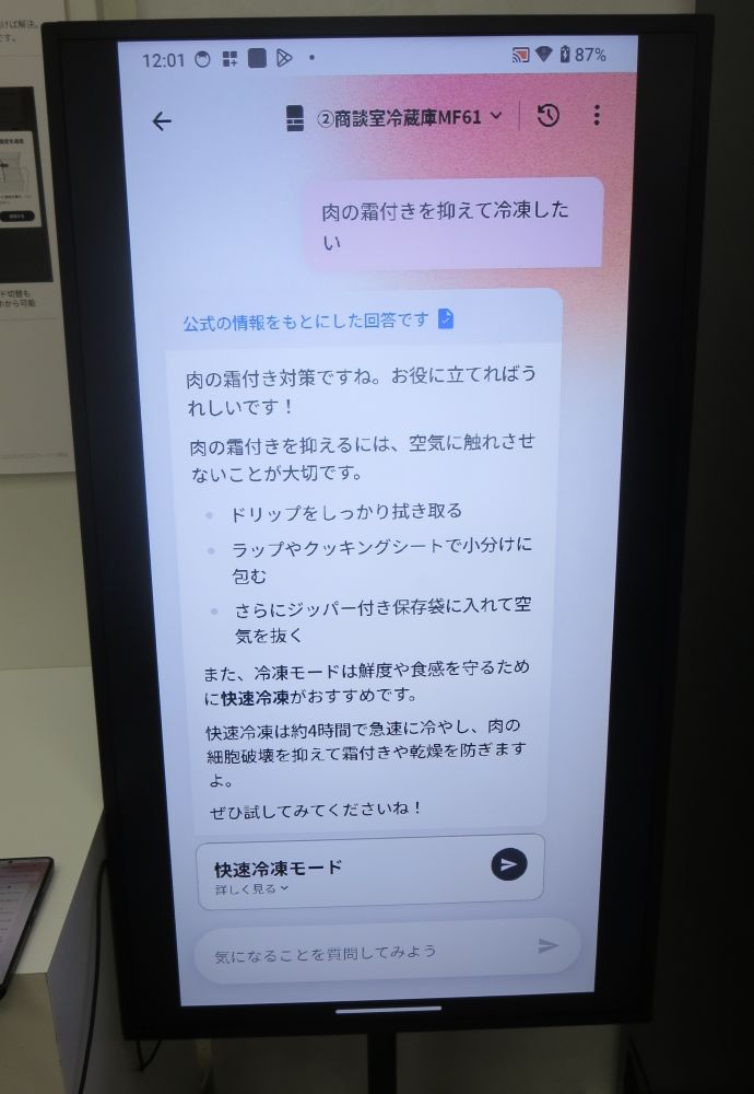 奥行き63㎝の薄型設計が特徴のFiT63シリーズ新製品は、生成AIサービス「COCORO HOME AI」に対応。使い方やお手入れ方法について、AIサービスに質問できる。例えば、保存方法を相談すると食材に適した冷凍モードを提案し、COCORO HOME AIから直接モード設定が可能だ。