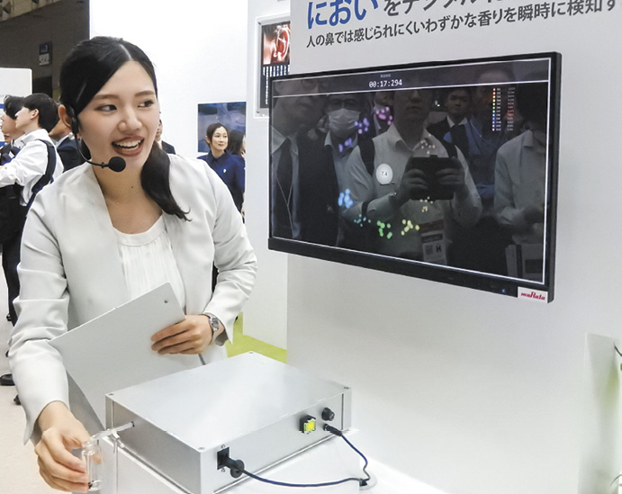 電子部品メーカー各社は新規事業創出への取り組みを加速する(CEATEC2025での村田製作所の「ニオイセンサ」プレゼンテーションの様子)