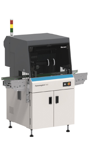 同社はまた、基板実装工程で使用される吸着用テープの除去機「Hummingbird-550」も出展する。コネクターやDIPスイッチなどの上面に吸着可能な平面部がない部品では、貼付されたテープを吸着している。専用ヘッドにセットしたセロテープを吸着用テープに押し付けて、端からめくる動作で除去する仕組みを採用した。特許出願済みの除去技術で、吸着テープをセロテープに貼り付いた状態で剝離。1枚当たり約1.5秒で自動除去できる。