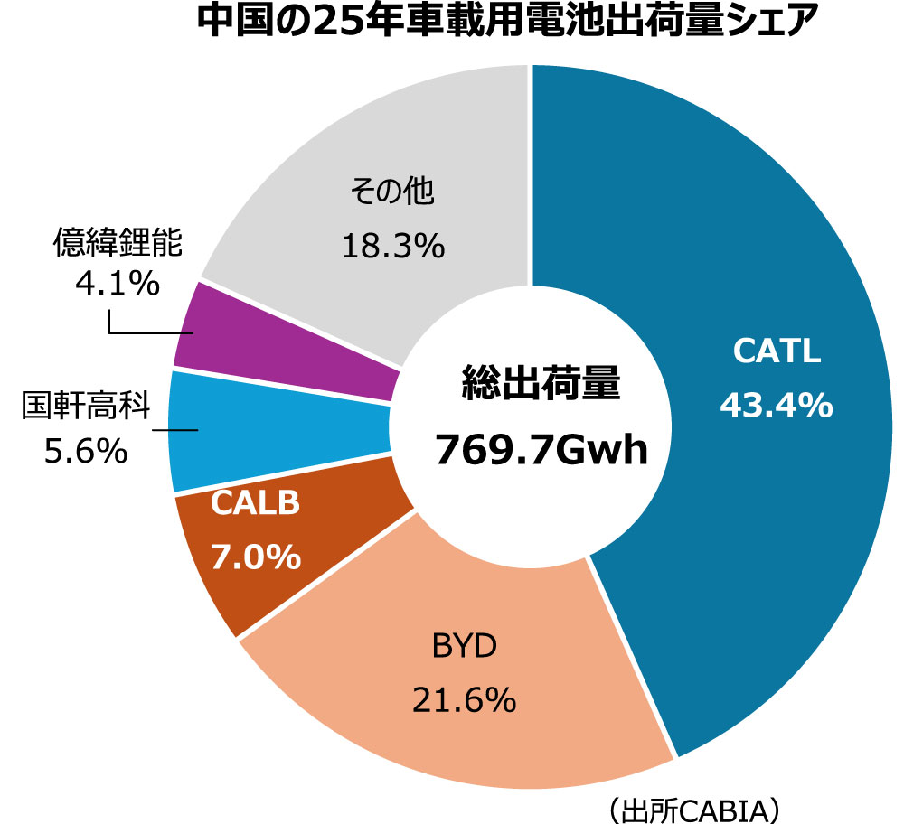 出荷量で25年のメーカー別車載電池シェアをみると、CATL(寧徳新時代能源)が前年比微減ながら、43.4%のシェアを占めて首位となった。同社の25年出荷量は333.57GWhで、2位のBYD(比亜迪)が21.6%のシェアとなり、165.77GWhの出荷量。中国の車載電池市場では、2桁のシェアを持つ上位2社の合計で64%を占めている。
