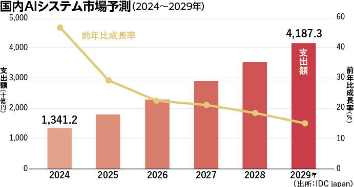 市場環境も追い風だ。調査会社IDCの予測によると、世界のAIソリューション支出額は2025年に3070億ドルと推定され、2028年には6320億ドル超とほぼ倍増を見込む。IDC Japanの調査では、日本の生成AI市場規模は2024年に1016億円規模から2028年に約8028億円へと7倍近い急成長を遂げる(年平均成長率84.4%)とされている。
