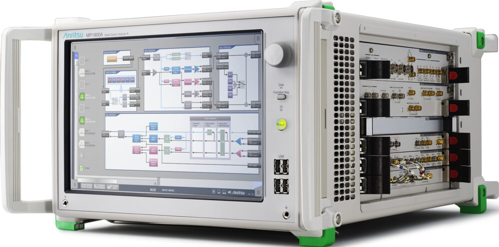 一方、AIデータセンター内部を支える光インターフェース技術も急速に進化している。光トランシーバーは800GbE時代から1.6TbE時代に突入し、レーン速度も100G/laneから200G/laneへと移行している。この高速化に伴い、製造工程で求められる測定帯域は拡大し、PAM4信号の波形品質評価はより高度化している。アンリツはこうした要求に対応するため、BERTWave MP2110Aに100 Gbaud PAM4光信号を測定できるオシロスコープオプションを追加した。MP2110Aは広帯域サンプリングオシロスコープとして1.6T光トランシーバーの量産用に最適で、次世代光信号の品質指標であるTDECQ (Transmitter Dispersion and Eye Closure Quaternary)を高い再現性で評価できる。4チャネルの測定ポートにより、1.6T(200G×8)光トランシーバーの出力を2台で同時測定でき、生産ラインの効率化と品質向上に大きく寄与する(写真2)。