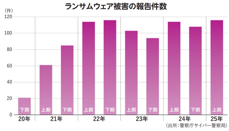「令和7年上半期における サイバー空間をめぐる脅威の情勢等について」によると、25年上期(25年1~6月)はデータを暗号化し利用不能にしてから復号化を条件に金銭を要求するランサムウエアの被害報告件数は116件に上り、半期の件数として22年下半期(7~12月)と並び最多。25年の被害は組織規模別では中小企業が77件と3分の2を占め、件数・割合が過去最多となった。ランサムウエアによる攻撃をサービスとして提供する「ランサムウエア・アズ・ア・サービス(RaaS)」の普及によって攻撃者の裾野が広がり、対策が比較的手薄な中小企業の被害増加につながっているとみられる。同年9月には飲料大手アサヒグループホールディングス、10月に事務用品通信販売大手アスクルなど下半期にかけ著名企業でも被害が相次いだ。