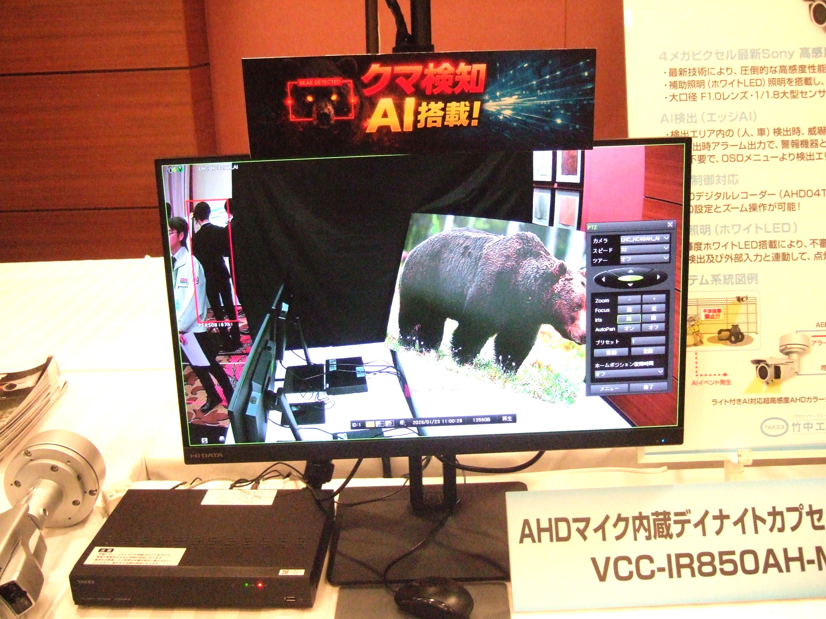 竹中エンジニアリングは、展示製品を防犯カメラ、セキュリティー用システム、入退室管理システム、自動ドア・シャッター機器など、9つのゾーンに分け、最新のソリューションを来場者に披露した。防犯カメラゾーンのライト付き対応超高感度AHDカラーカメラを参考出品。同社では、この装置で現在日本各地に出没しているクマを真夜中でもAI(人工知能)で感知できないかどうかを研究中という。係員によると、人かクマかを識別するためにはもう少しクマのデータを取り込むことが必要としている。