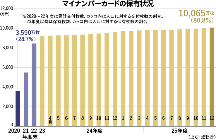 マイナンバーカードの保有枚数が2025年12月、初めて1億枚を突破した。公的な本人確認書類として定着が進む中、デジタル庁は官民双方でカードを活用したサービスの拡大を図り、生活の利便性向上や手続きの効率化につなげたい考えだ。行政サービスに加えて、魅力ある民間サービスの選択肢をどれだけ広げられるかが、さらなる普及の鍵となりそうだ。