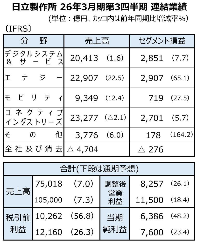 2026.01.29 日立、26年3月期業績を上方修正 電力網・鉄道事業の拡大が寄与