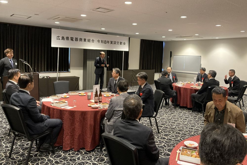 広島県電器商業組合は28日、広島市南区のTKPガーデンシティ広島駅前大橋で年賀詞交歓会を開催した。中国総合通信局やNHK、中国電力、ちゅピCOMなどの来賓に加え、組合関係者ら35人が出席した。