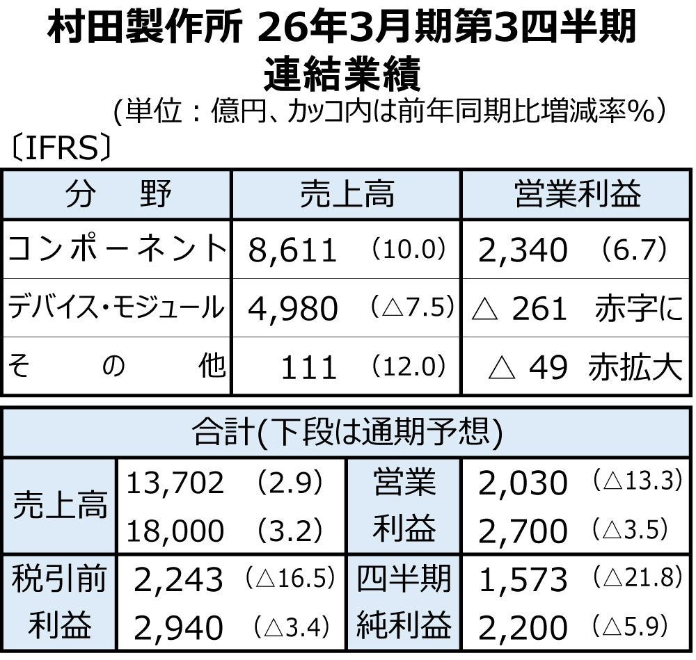 村田製作所が2日発表した2026年3月期第3四半期(25年4~12月)連結決算は、売上高が堅調に推移した。一方で、利益面ではコストダウンなど増益要因はあったものの、製品価格の値下がりやのれんの減損損失計上などもあり、全体では2桁の減益となった。
