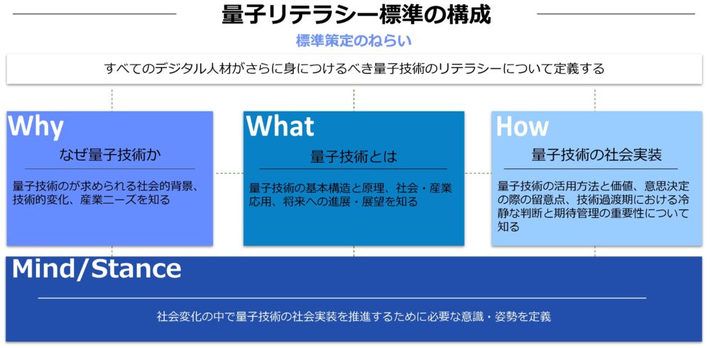標準は「なぜ量子技術か」「量子技術とは」「社会実装」「姿勢・意識」の4軸で構成し、小項目や学習到達度、活用シーンまで具体化した。内閣府の府省横断型研究開発支援プログラムである内閣府のBRIDGE事業の一環として策定され、産学共通の人材育成基盤構築を狙う。