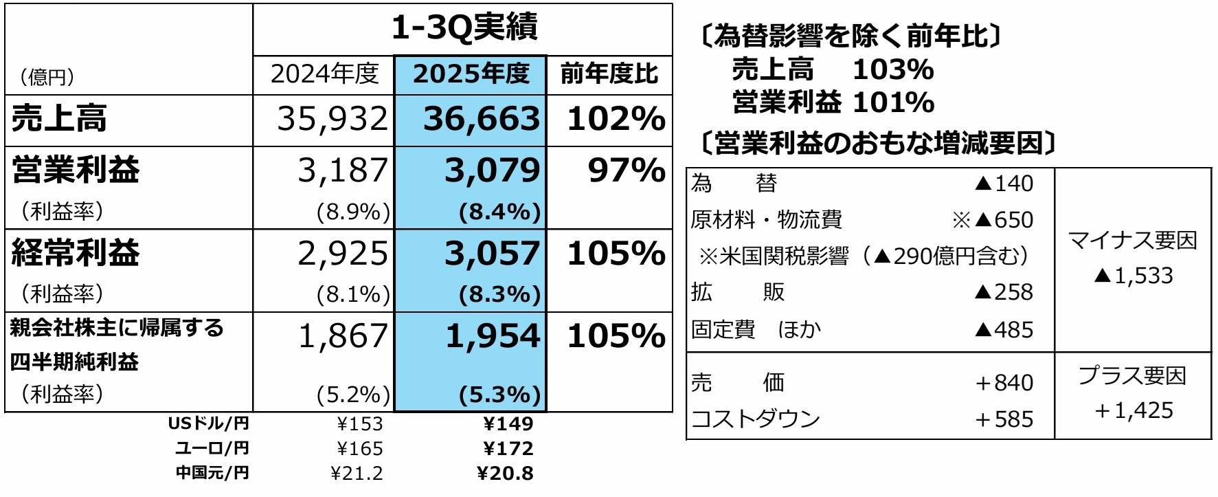 売上高は前年同期比102%の3兆6663億円で、営業利益が同97%の3079億円となった。米トランプ政権による関税政策の影響は290億円だったが、売価アップやコストダウンで吸収した。