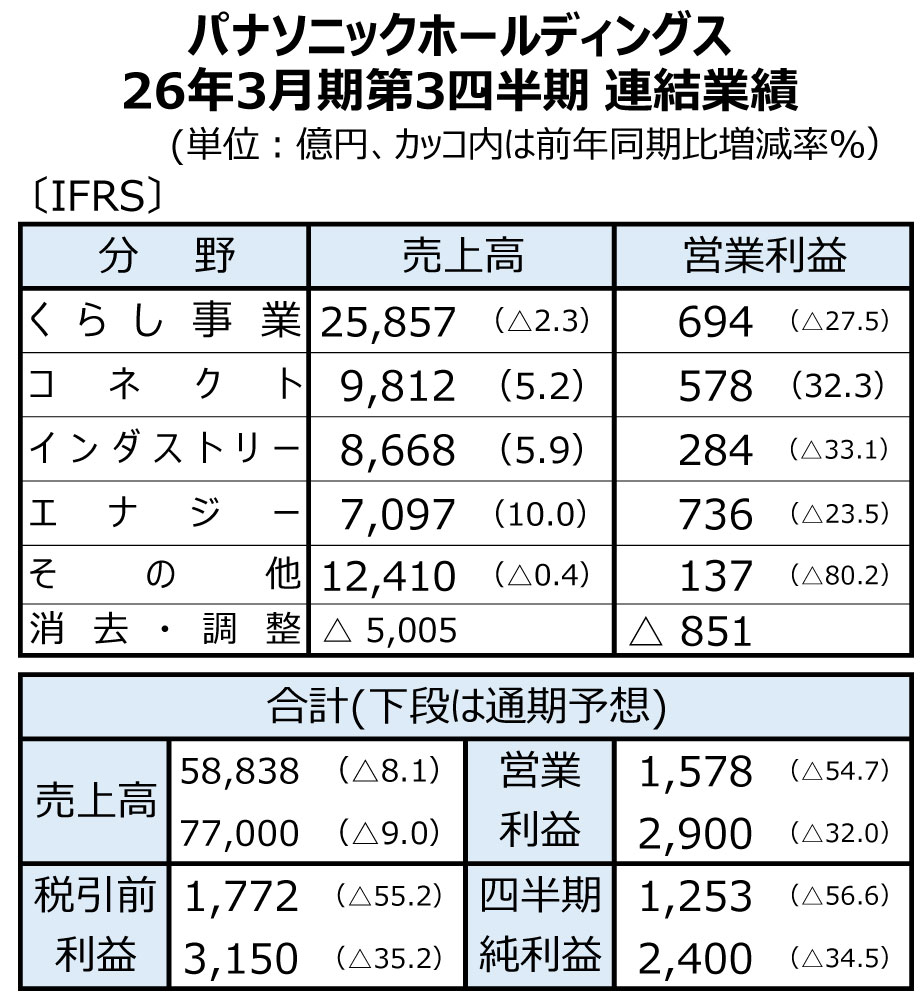 パナソニックホールディングス(HD)が4日発表した2026年3月期第3四半期(25年4~12月)の連結決算は、減収減益となった。売上高は、前年同期比8.1%減の5兆8837億円。利益面は、営業利益が同54.7%減の1577億円、純利益が同55.0%減の1389億円だった。