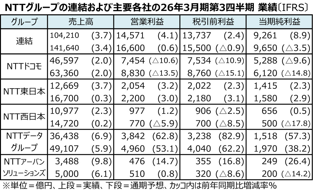 NTTが5日発表した2025年度第3四半期(2025年4~12月)の連結決算は、営業収益(売上高)は前年同期比3.7%増の10兆4210億円と、第3四半期として過去最高を更新した。営業利益も同4.1%増...  (つづく)