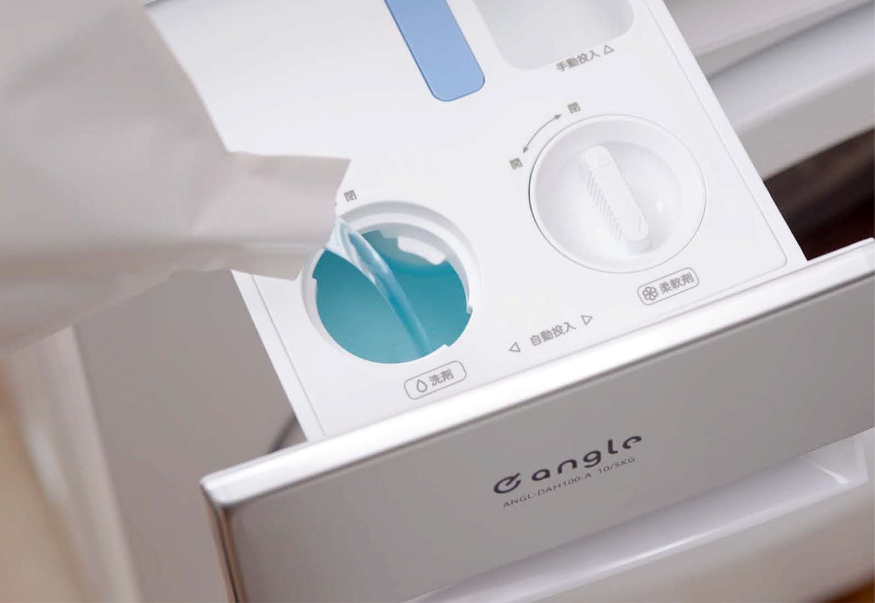 洗剤・柔軟剤自動投入機能は、液体洗剤が約570ml、柔軟剤が約360ml入る自動投入タンクを搭載。毎回洗剤を計量する手間を省け、入れ過ぎなどの無駄も防げる。