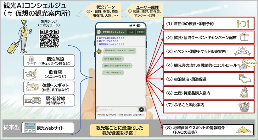 伊藤忠テクノソリューションズ(CTC)は10日、群馬県の安中市観光機構や関東広域観光機構と連携し、生成AI(人工知能)を活用した次世代観光案内サービス「観光AIコンシェルジュ」を開発し、1月から安中市で提供を開始したと発表した。24時間対応で旅行者一人一人に最適な提案を多言語で行い、地域観光の課題解決と消費拡大を支援する。