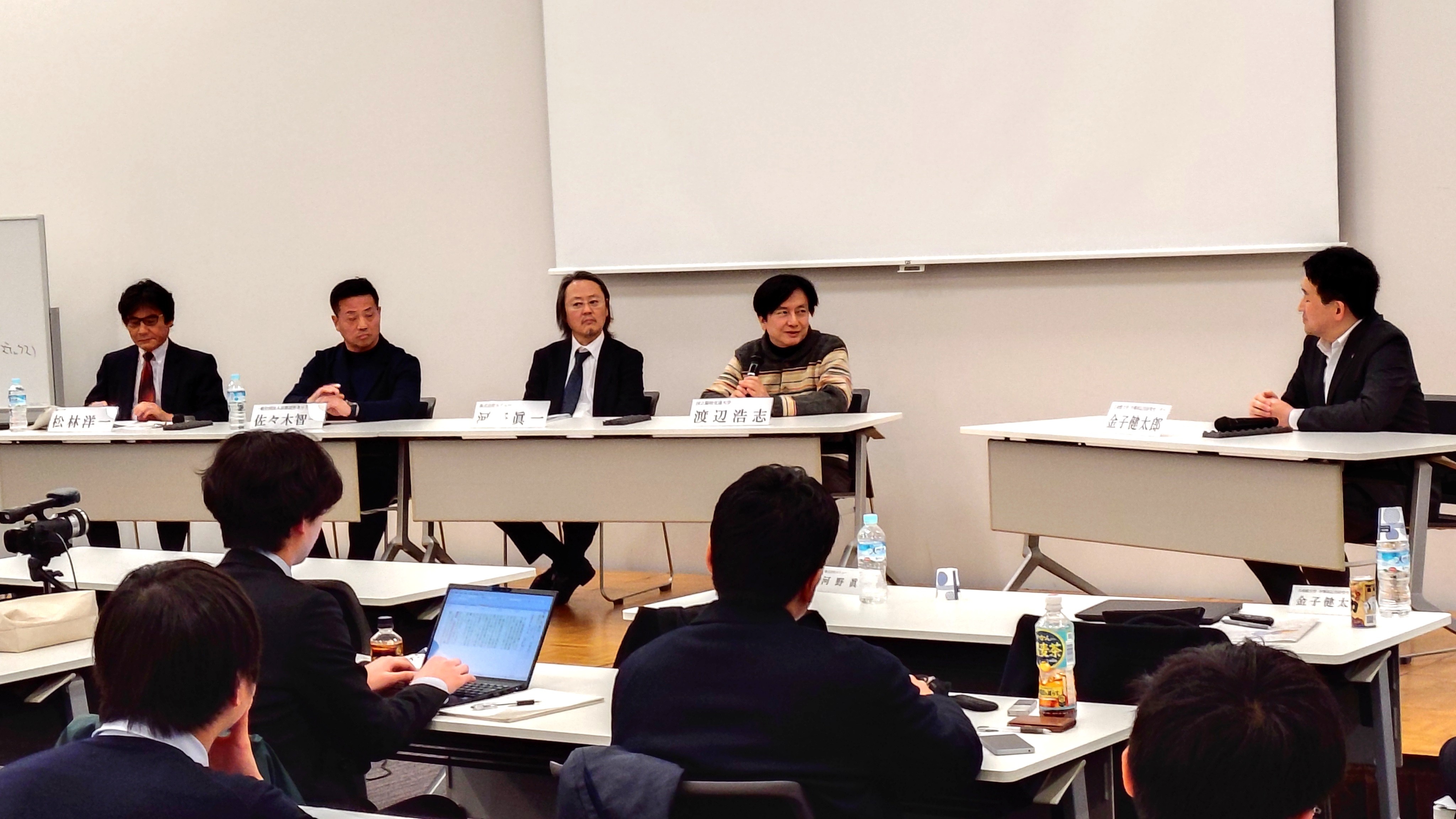 熱心に討論する(左から)松林氏、佐々木氏、河野氏、渡辺氏、金子氏