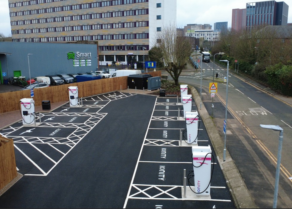 英バーミンガムの充電拠点。高速道路中心の戦略から転換し、都市型充電拠点を拡充する