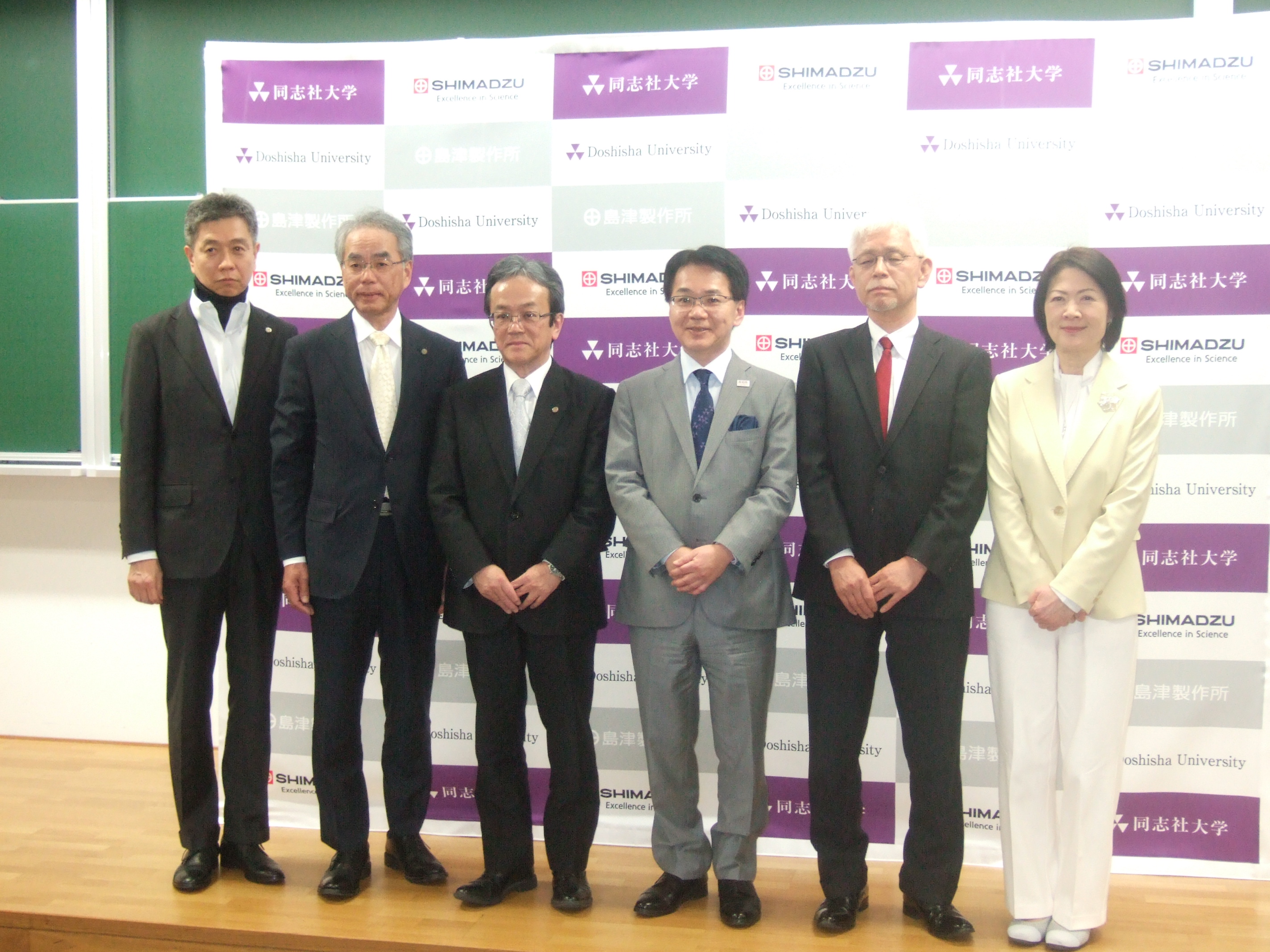 協定発表の会見には、同志社大からは小原克博学長と野口範子生命医科学部教授らが、島津製作所からは上田輝久会長、山本靖則社長らが出席した。