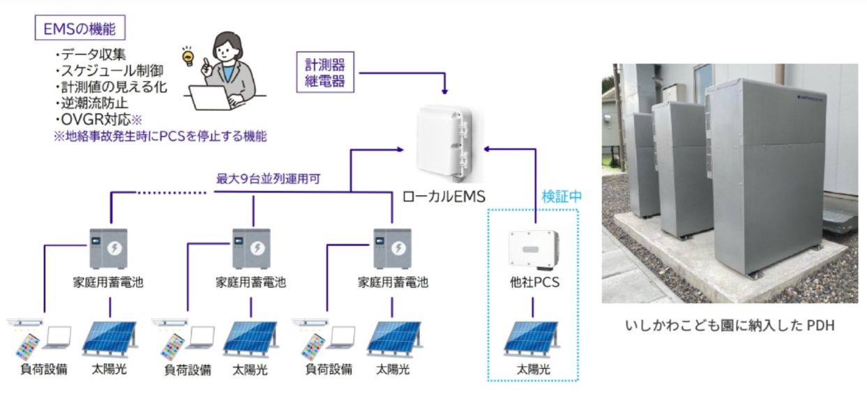 住友電工グループは、こうした課題を解決するためグループの技術とノウハウを結集し、日新システムズが開発したローカルEMSにより、住友電工製の家庭用蓄電池「POWER DEPO H(PDH)」を最大9台まで並列運用できるようにした。