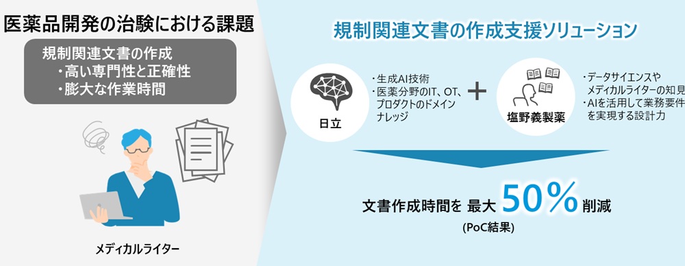 今回のソリューションは、塩野義のメディカルライターが持つ専門知識や実務経験、データサイエンティストのデータ活用力とAI設計力に、日立の生成AI活用ノウハウを組み合わせて開発した。現場の業務フローを反映した設計により、導入直後から実務で活用できる点が特徴だ。日本語と英語が混在する膨大な治験データから要点を抽出し、規制関連文書の初稿を自動生成する。