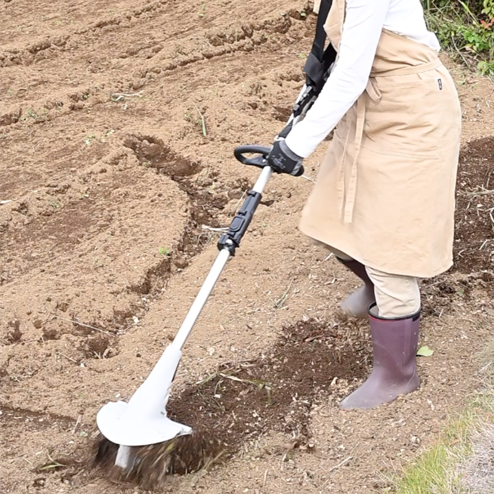 用途に応じて先端アタッチメントを付け替えることで、耕運、草刈りなど、庭のさまざまな作業に対応。複数の機器を使い分ける必要もなく、省スペースで効率的な庭仕事が可能になる。