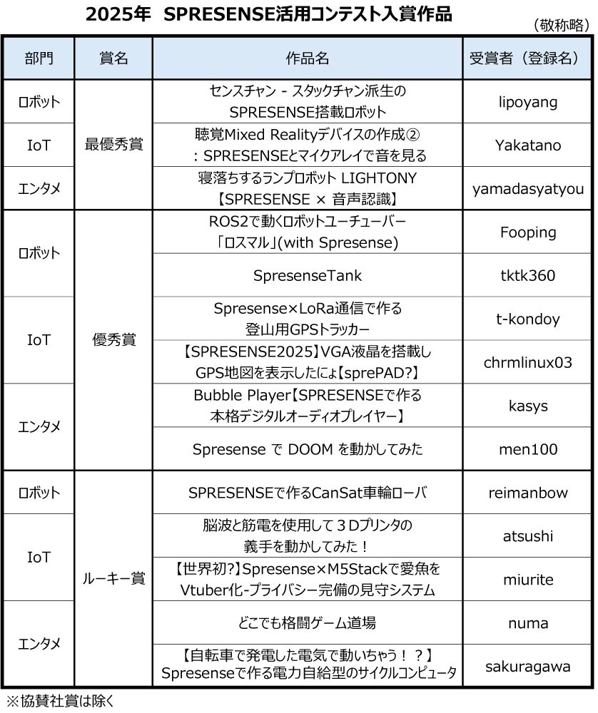 協賛賞を含む受賞者作品は、Webページ(https://elchika.com/promotion/spresense2025/winner)で紹介している。