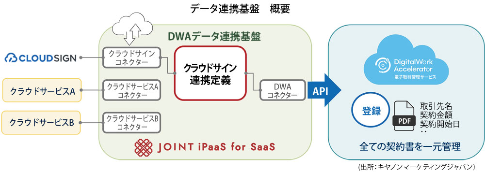 キヤノンマーケティングジャパン(キヤノンMJ)は、デジタルドキュメントサービス「DigitalWork Accelerator電子取引管理サービス」で、ストラテジットが提供するSaaS連携ソリューション「JOINT iPaaS」との接続を開始する。企業内で分散しがちなドキュメントや業務データを一元的に管理・活用できる環境を提供し、契約業務をはじめとするバックオフィス業務の効率化と品質向上を支援する。