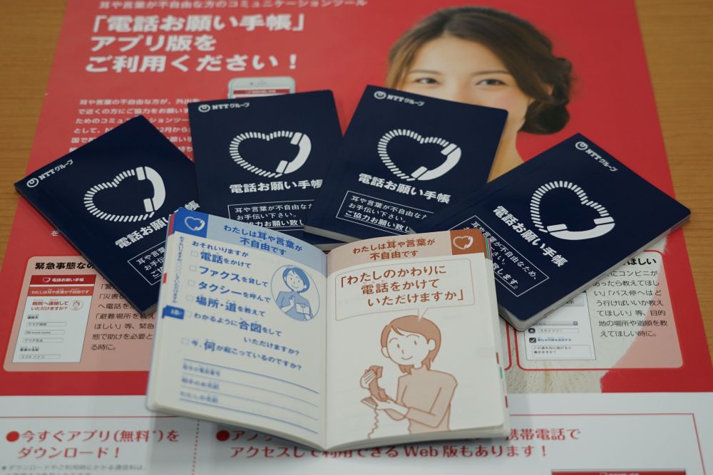 電話お願い手帳は、耳や言葉の不自由な人が電話連絡などを行う必要がある時、用件や連絡先などを書いて近くの人に協力を頼むためのツールとして利用されている。この手帳は、1983年に千葉県の流山電報電話局(当時)に寄せられた声を元に、同局と千葉県流山市の聴力障害者部会(現・流山デフ協会)、流山市が共同で考案。当時普及し始めたばかりのFAXで、耳や言葉が不自由な人がいる世帯と消防署を結ぶ緊急時の連絡ツールとして全国に先駆けて作成された。同局から関東エリア、さらに全国に広がり、毎年内容を充実させながら継続発行し、今年で44年目を迎えた。