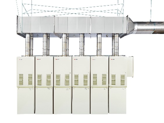 これまで展開してきた屋内設置形の高効率業務用ガス給湯器(16号、24号)に加え、50号の最大号数モデルを高効率タイプのラインアップに加えた。最大24台(合計1200号)まで連結が可能で、大量のお湯を必要とする大型の浴場や宿泊施設などで給湯設備の屋内設置に対応する。