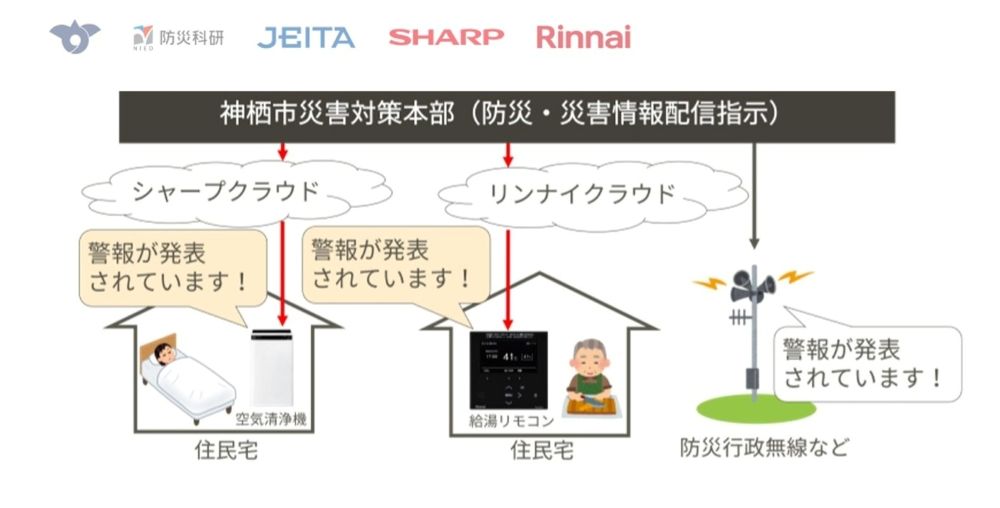 同実験では、災害対策本部や避難所に加え、市内在住の防災士の自宅にIoT対応と発話機能を備えたシャープ製空気清浄機(防災士宅3カ所、災害対策本部1カ所、避難所1カ所)、リンナイ製給湯リモコン(防災士宅1カ所、災害対策本部1カ所)を設置する。