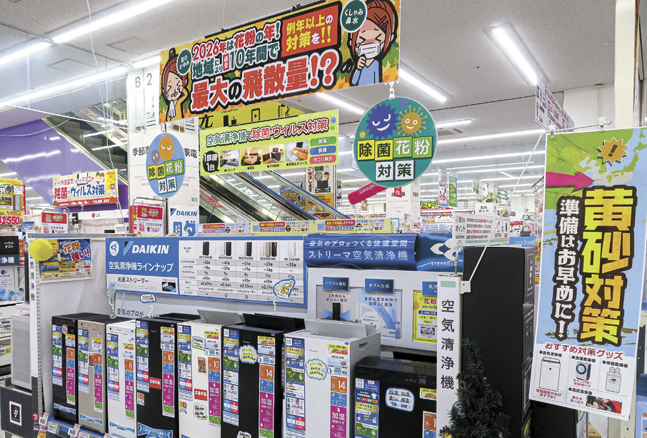 花粉飛散の季節に合わせて、家電量販店の店頭では空気清浄機のラインアップを充実させ、大型POPで打ち出している。九州北部は、花粉だけでなく、黄砂やPM2.5への対策としても空気清浄機が活躍するため、福岡は世帯保有率が高い。コジマ×ビックカメラ福岡春日店(福岡県春日市)でも、一家に1台ではなく、1部屋に1台を推奨し、空気清浄機の拡販に力を入れている。