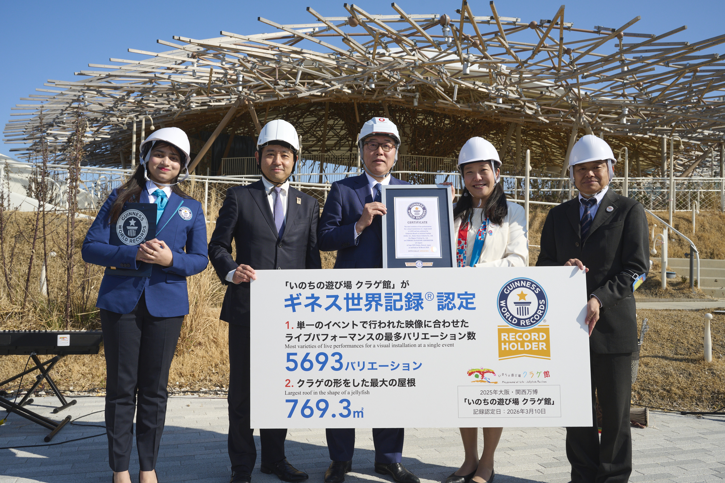 読売テレビ放送が映像を制作した大阪・関西万博のシグネチャーパビリオン「いのちの遊び場 クラゲ館」が、二つのギネス世界記録を達成しにた。16日に解体直前のクラゲ館前で、公式認定証の授与が行われた。同パビリオンは、音楽家・数学者の中島さち子さんがプロデュースした。