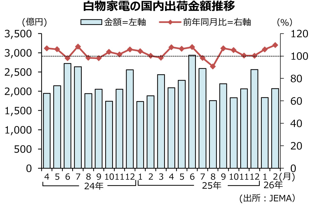 2026.03.23 2月の白物家電国内出荷額、6カ月連続プラスに エアコン・冷蔵庫は2桁伸長 JEMA