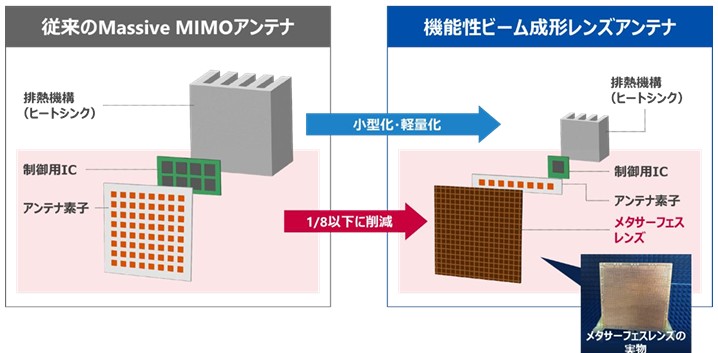 AGCはソフトバンクと共同で、次世代高速通信対応の新たな構成の基地局アンテナ「機能性ビーム成形レンズアンテナ」を開発し、屋外での通信エリア形成の実証に成功した。AGCのメタサーフェスレンズ技術と、ソフトバンクの通信エリア設計技術やアンテナビーム設計技術を組み合わせて開発した。今後運用が見込まれる6G基地局などへの貢献を見込む。