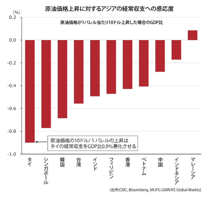 タイはエネルギーの輸入依存度が高く、有事の際にはバーツ通貨が各市場で売られやすい。実際、米国による攻撃開始以降、バーツ安が進行している。また、タイは他アジア周辺国に比べて原油価格上昇に対する経常赤字の感応度が高く、経済全体に与える影響も相応にある。