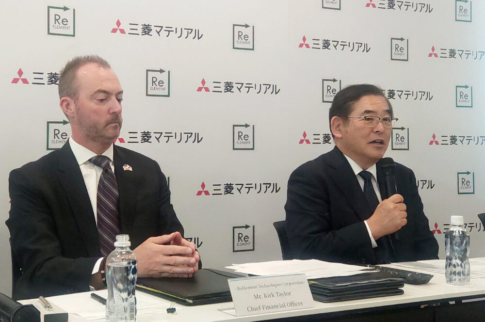レアアースリサイクルの日米協業について記者会見する田中徹也三菱マテリアル社長(右)と米リエレメントテクノロジーズのカーク・テイラーCFO=31日午後、東京都千代田区