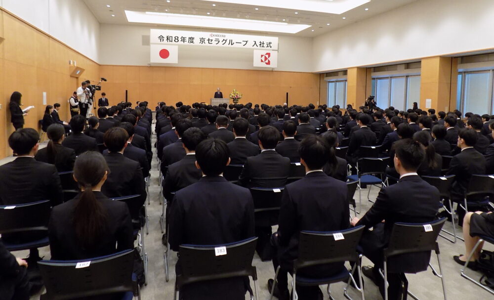 京セラは1日、入社式を京都市伏見区の本社で開催した。式には京セラ本体に入社した186人が参加した。作島史朗社長、山口悟郎会長ら幹部5人が出席。本社会場をキーステーションに、子会社の5拠点へオンライン配信し、全会場同時進行で新入社員を激励した。